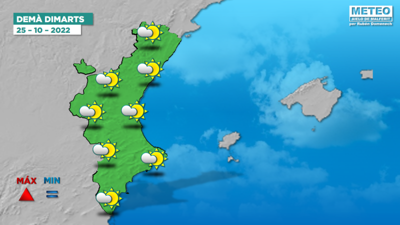 Demà continuarem amb un ambient estable. Començarem el día amb alguns núvols baixos i algunes boirines, més probables en punts de la costa, però que es desfaran en calfar el sol. En general ens mantindrem amb el cel ras i amb pas de núvols alts, que amb la companyia de la calitja deixaran un ambient tèrbol i lleig. Les temperatures mínimes no patiran grans canvis i les màximes pujaran, especialment a l'interior.