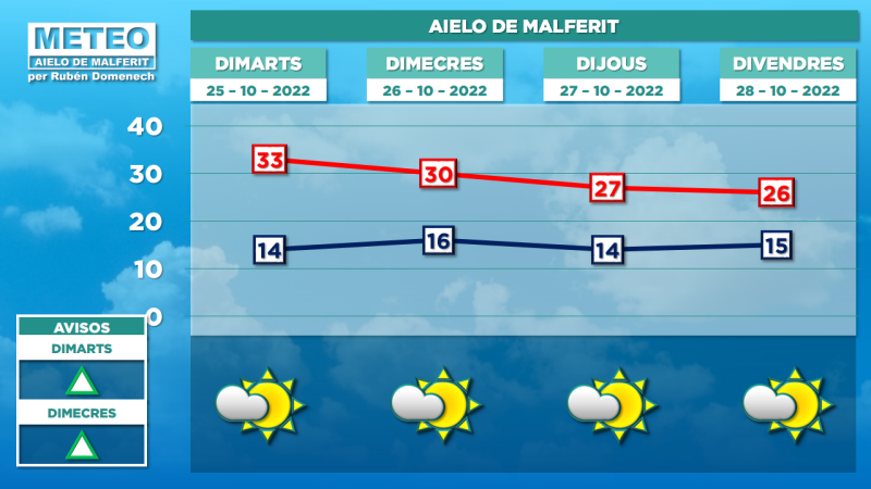 A partir de dimecres continuarem amb pas de núvols alts i amb calitja, però pareix que les temperatures màximes tindran una tendència a baixar, per a quedar en valors més frescs de cara al cap de setmana.